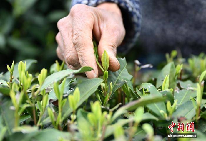 3月27日,采茶工摘下龙井茶的嫩芽。中新社记者 王刚 摄