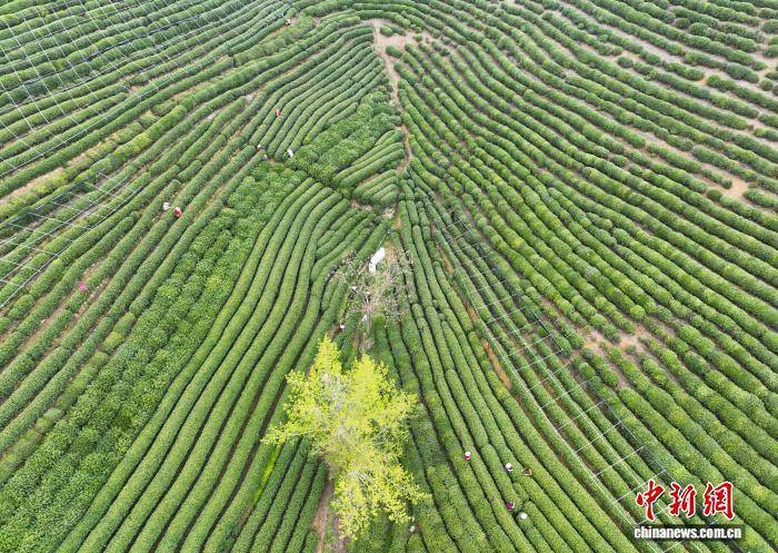 3月27日,多名采茶工在龙井茶园内忙于采摘龙井新茶。(无人机照片)中新社记者 王刚 摄