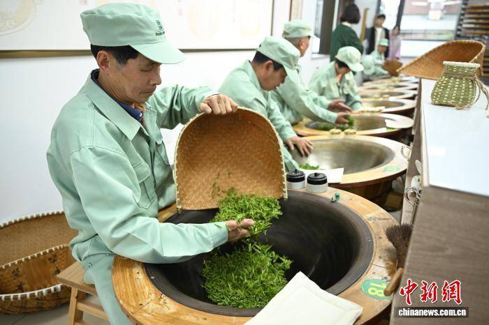 3月27日,杭州顶峰茶业的炒茶师进行传统手工炒茶。中新社记者 王刚 摄