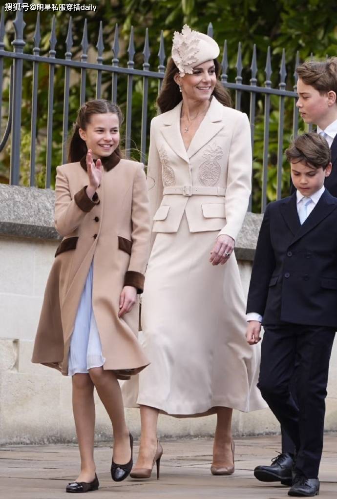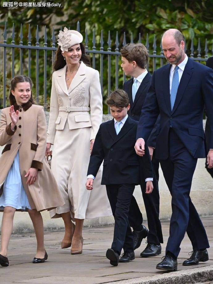 在温莎城堡圣乔治礼拜堂举行的传统礼拜中,凯特王妃又穿了2022年穿过的Self-Portrait 米白色套裙,配搭同色礼帽,脚踩尖头高跟鞋,优雅亮相。