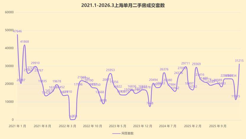 回顾上海2016~2025年的二手房成交量,2016年37.55万套,2017年16.94万套,2018年16.48万套,2019年24.26万套,2020年31.79万套,2021年28.10万套,2022年17.63万套,2023年19.91万套,2024年24.11万套,2025年25.41万套。